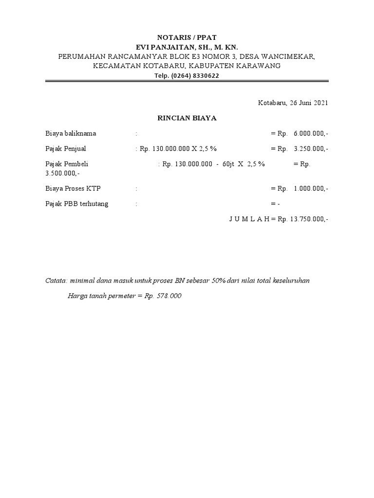 Biaya notaris mencakup pengurusan Akta Jual Beli (AJB), balik nama sertifikat, serta pengikatan kredit. Besarnya tergantung nilai rumah dan kebijakan notaris setempat. Biaya ini bersifat wajib karena berkaitan langsung dengan legalitas kepemilikan rumah.